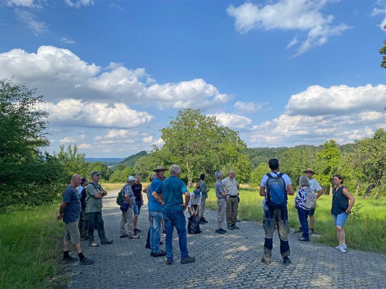 Über den bekannten Aussichtspunkt mit Ausblick auf die Stadt ging die Exkursion weiter bis zur ehemaligen Panzerwaschanlage. Gebietsbetreuer Hertrich stellte dabei heraus, dass einige Bereiche beweidet, andere gemäht werden, je nachdem welche Zielarten dort vorkommen. Diese entscheiden bei den artenreichen Wiesen am ehemaligen Standortübungsplatz auch den Schnittzeitpunkt: Nicht zu früh, um bodenbrütende Vogelarten nicht zu stören; aber auch nicht zu spät, um die vielfältige Flora zu erhalten. Diese Balance zu finden, benötigt eine engmaschige Kontrolle und viel Einsatz des Gebietsbetreuers.