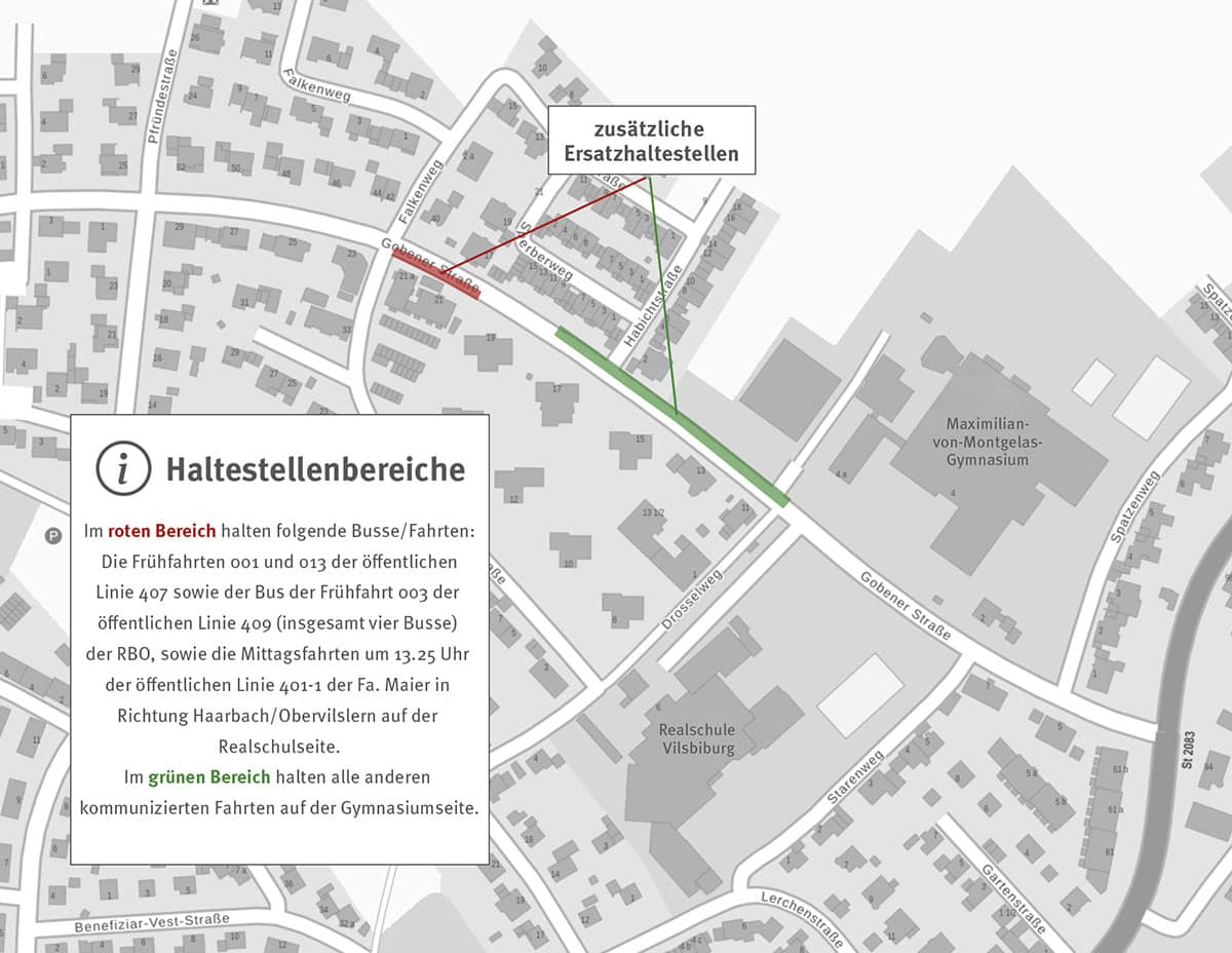 Die Bushaltestelle an der Staatlichen Realschule Vilsbiburg โ€“ offizielle Bezeichnung โ€žVilsbiburg, Gymnasiumโ€œ โ€“ wird wรคhrend des Abbruchs und Neubaus der Realschule ab dem Schuljahresbeginn 2024/2025, ab Dienstag, 10.09.2024, umverlegt und eine zusรคtzliche Ersatzhaltestelle an der Gobener StraรŸe / Ecke AmselstraรŸe nur zum Ausstieg wird eingerichtet.