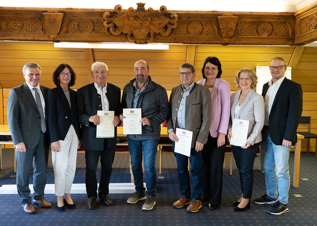 Sie kennen die Fluren, Grenzen und รcker ihrer Heimatgemeinden wie niemand sonst: Sieben Feldgeschworene sind am Landratsamt fรผr ihr 60- bzw. 25-jรคhriges Engagement in diesem besonderen Ehrenamt ausgezeichnet worden, drei von Ihnen wurde die Ehrung im Auftrag des Bayerischen Heimatministers Albert Fรผracker persรถnlich รผberreicht.