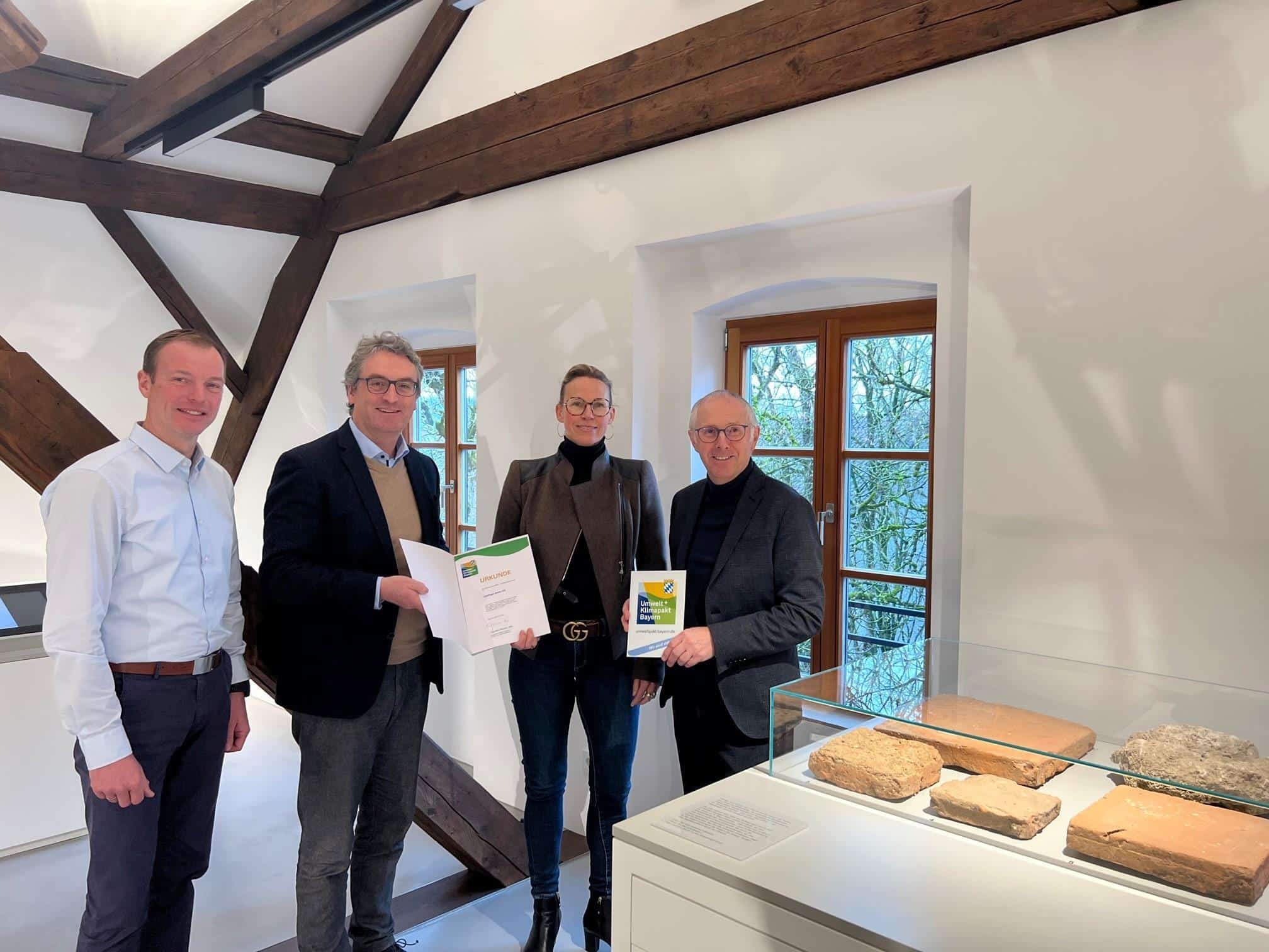 Die vom Bayerischen Umweltminister Thorsten Glauber unterzeichnete Urkunde wurde von Ludwig Götz von der Wirtschaftsförderung Landkreis Landshut an die Geschäftsführerin Caterina Bader, den Geschäftsführer Paul Simmerbauer sowie den neuen Projektleiter für Energie und Nachhaltigkeit, Michael Schippler, überreicht.